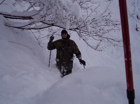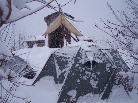 Über Nacht schneite es unendwegt, sodass am nächsten Morgen schon 25 cm Schnee lagen. Nach kurzem Frühstück packten wir alles zusammen, und setzten unseren weg fort. Nachdem wir mit unserem Gepäck durch den Schnee stark behindert zur Mittagszeit merkten, das wir unser Tagesziel nicht, oder nur im Dunkel erreichen werden kann, entschieden wir die Umkehr zum alten Zeltplatz. Diese Entscheidung erwies sich im nachhinein als sehr Weise. Es schneite noch 2 Tage unaufhörlich. Nachts waren wir gezwungen unsere Zelte vom Schnee zu befreien.